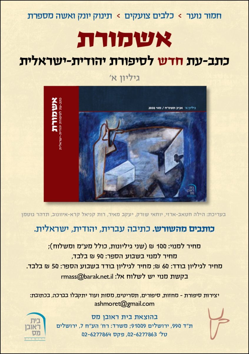 In the summer of 2008, a festive evening at the “Tmol Shilshom” café-bookstore in Jerusalem marked the launch of the first issue of Ashmoret, a literary journal dedicated to Jewish-Israeli fiction.